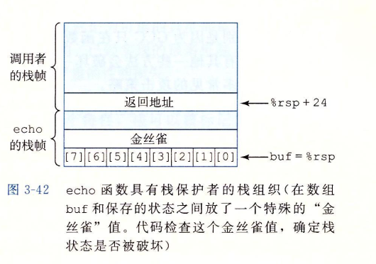 最近的GCC版本在产生的代码中加入了一种栈保护者机制,用来检测缓冲区越界,其思想是在栈中任何局部缓冲区与栈状态之间存储一个特殊的金丝雀值。这个金丝雀值是在程序每次运行时随机产生的,因此,攻击者没有简单的办法知道它是什么。