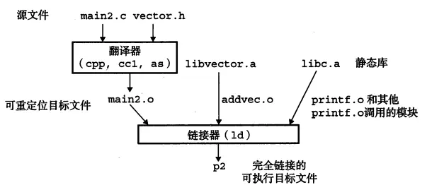 像printf等一些常用的函数,都是在libc.a静态库中,静态库以一种存档的特殊文件(.a)格式,将可以定位的目标文件集合成一个.a文件。