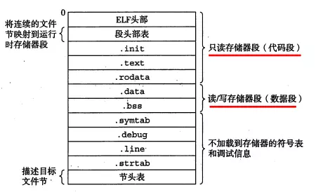 1 | .text:已编译程序的机器码;.rodata:只读数据(read-only-data); |