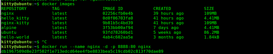 1 | kitty@ubuntu:~$ docker pull nginx |