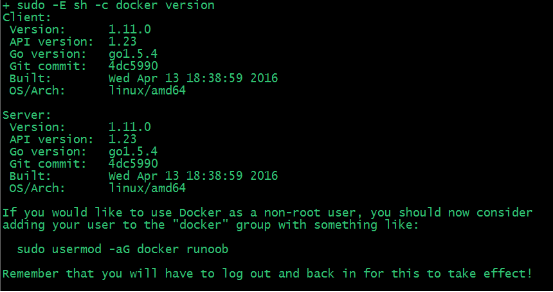 1 | runoob@runoob:~$ wget -qO- https://get.docker.com/ | sh |