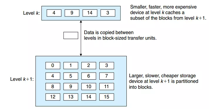 缓存命中:当程序需要第k+1层数据块14的时候,程序会在当前存储的k层,寻找块14的数据,刚好14在k层的话,就是一个缓存命中,这比从k+1层读取的速度要快很多。