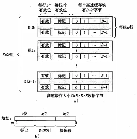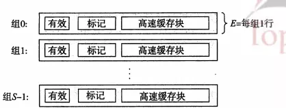 高速缓存是一个数组,每个组包含一个或多个行,每个行有一个有效位、一个标记位,以及数据块。我们进行访问的地址结构就是:t的标记位+s个组索引+b个块偏移;