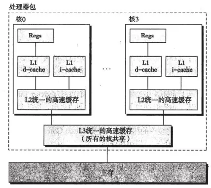 在实际的商用CPU中,将高速缓存分为d-cache数据高速缓存,i-cache指令高速缓存和同一高速缓存,i7的架构中我们可以看出,L1分为数据和指令高速缓存,共享L2高速缓存,同时每个核共享L3高速缓存