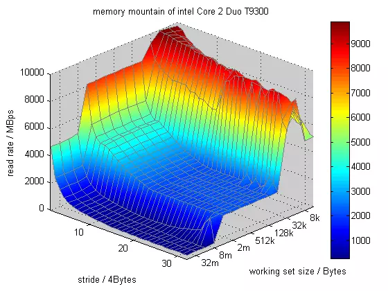 这段代码所做的事情,就是将data数组的内容依次读取到CPU的寄存器中。其中elems代表的是data的工作集大小也就是size时间局部性,代表Y轴;而stride(步长)代表的是横轴X;Z轴表示吞吐量,Mb/s。越往上吞吐量越大(红色部分)。我们反复以不同的size和stride值调用我们的核心测试代码,就会得到如上图的存储器山。最高处的红色山峰为L1,由于工作集(size)很小,能全部保存在L1高速缓存中,所以这时候即使stride很长,对于性能也没太大的影响。L2和L3、主存随着stride的增加有明显的坡度,空间局部性下降。特别明显的是,主存的蓝色山峰,即使工作集很大(时间局部性极地)其stride(空间局部性)的影响也相当的明显,最高与最低处相差7倍。也就是告诫我们,即使时间局部性无法改变了,空间局部性也可以使得程序的性能极大的提高。