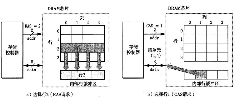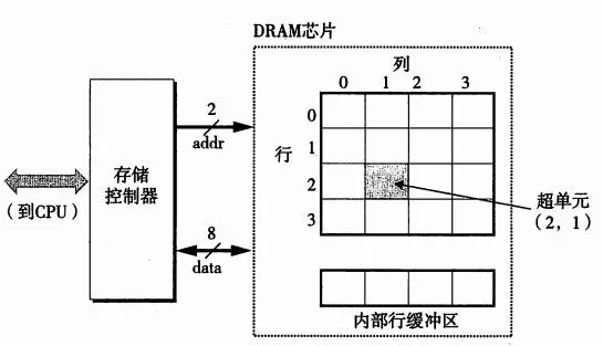 为了加快二维数组的访问,存储控制器在读取(2,1)处的内容的时候,使用addr先发送行地址2到DRAM芯片中,拷贝整个第二行的内容到内部缓冲区中,然后发送列地址1,从内部行缓冲区中读取1的地址内容通过data发送到存储控制器中去。