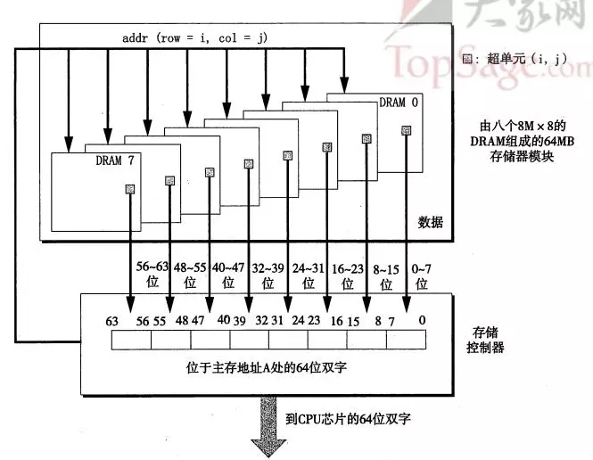如图所示是一个64M的主存,芯片编号0-7,每个芯片存储8M的数据,存储器模块将其组合起来,聚合内存。将每单个芯片的超单元映射成主存地址A的各个字段。这样控制器收到一个主存地址A的时候,存储控制器将其选择包含的具体芯片,将A转换成(i,j)的形式,然后将(i,j)发送到芯片模块中开始取数据。