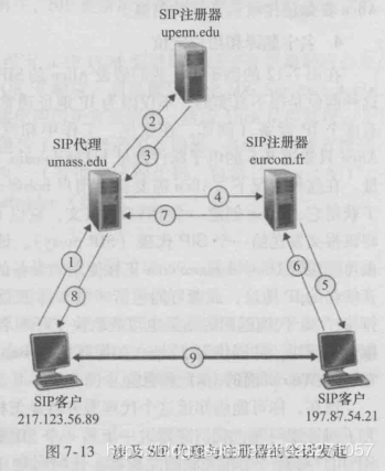 每个SIP用户都用相关联的SIP注册器,每当用户切换到新设别时,就会想SIP注册器注册新的IP地址.下图就是其作用机制:
