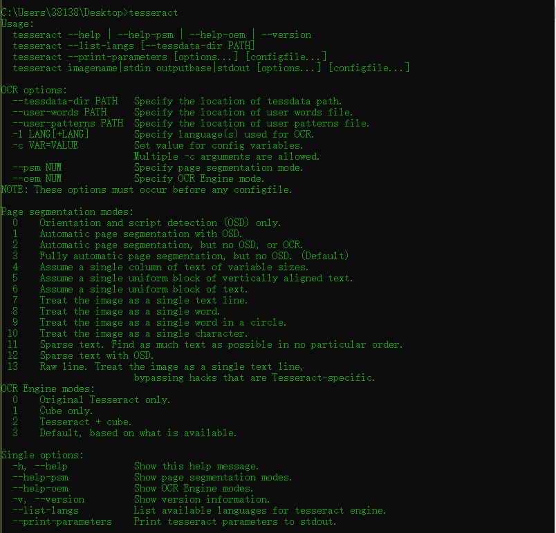 1 2 3 tesseract_cmd = '{你自己tesseract安装的目录}' 比如我的↓ tesseract_cmd = 'C:/tesseract/Tesseract-OCR/tesseract'