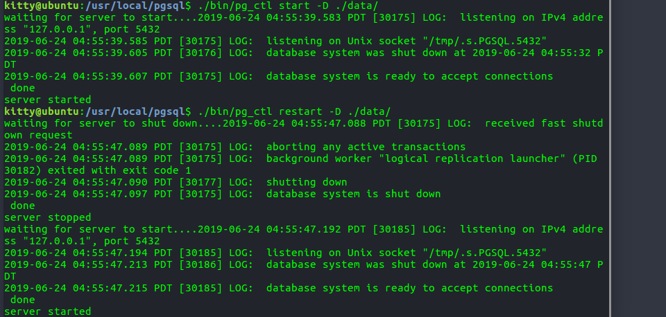 1 | ./bin/pg_ctl start -D ./data/ -l logfile |