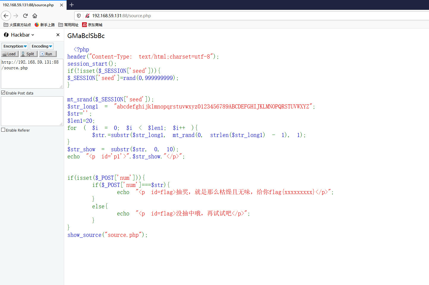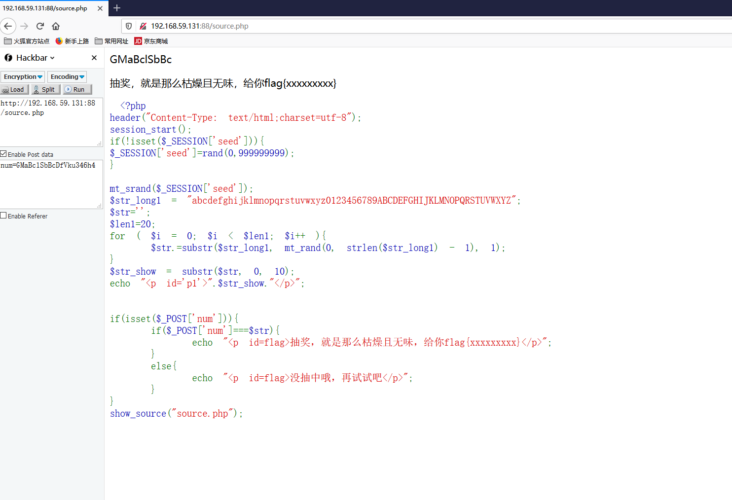 if(isset($_POST['num'])){ if($_POST['num']===$str){ echo "<p id=flag>抽奖,就是那么枯燥且无味,给你flag{xxxxxxxxx}</p>"; } else{ echo "<p id=flag>没抽中哦,再试试吧</p>"; } } show_source("check.php");