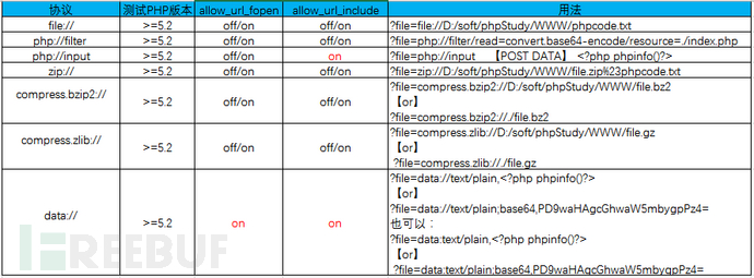 | php:// — 访问各个输入/输出流(I/O streams) file:// — 访问本地文件系统 phar:// — PHP 归档 zlib:// — 压缩流 data:// — 数据(RFC 2397) http:// — 访问 HTTP(s) 网址 ftp:// — 访问 FTP(s) URLs glob:// — 查找匹配的文件路径模式 ssh2:// — Secure Shell 2 rar:// — RAR ogg:// — 音频流 expect:// — 处理交互式的流