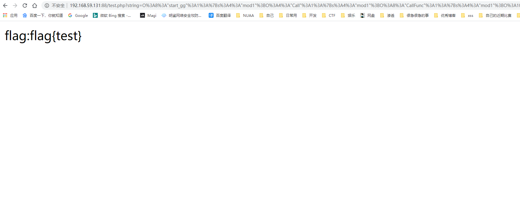 那再看这个长的demo-第一次看确实很难受,但是理解后会发现真的妙不可言~ 1 2 3 4 5 6 7 8 9 10 11 12 13 14 15 16 17 18 19 20 21 22 23 24 25 26 27 28 29 30 31 32 33 34 35 36 37 38 39 40 41 42 43 44 45 46 47 48 49 50 51 52 53 54 55 56 57 58 <?php class start_gg { public $mod1 ; public $mod2 ; public function __destruct ( ) { $this ->mod1->test1 (); } } class Call { public $mod1 ; public $mod2 ; public function test1 ( ) { $this ->mod1->test2 (); } } class CallFunc { public $mod1 ; public $mod2 ; public function __call ($test2 ,$arr ) { $s1 = $this ->mod1; $s1 (); } } class InvokeFunc { public $mod1 ; public $mod2 ; public function __invoke ( ) { $this ->mod2 = "字符串拼接" .$this ->mod1; } } class ToStringFunc { public $str1 ; public $str2 ; public function __toString ( ) { $this ->str1->get_flag (); return "1" ; } } class GetFlag { public function get_flag ( ) { echo "flag:" ."flag{test}" ; } } $a = $_GET ['string' ];unserialize ($a );?>