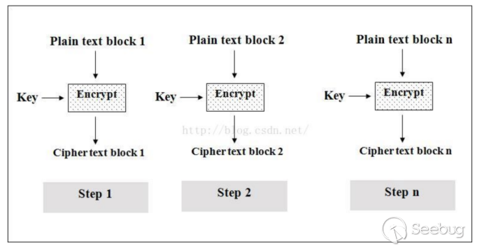 As we can see,we just need block the plaintext.Encryto every piece,than split joint every ciphertext.this is ECB encryption mode.